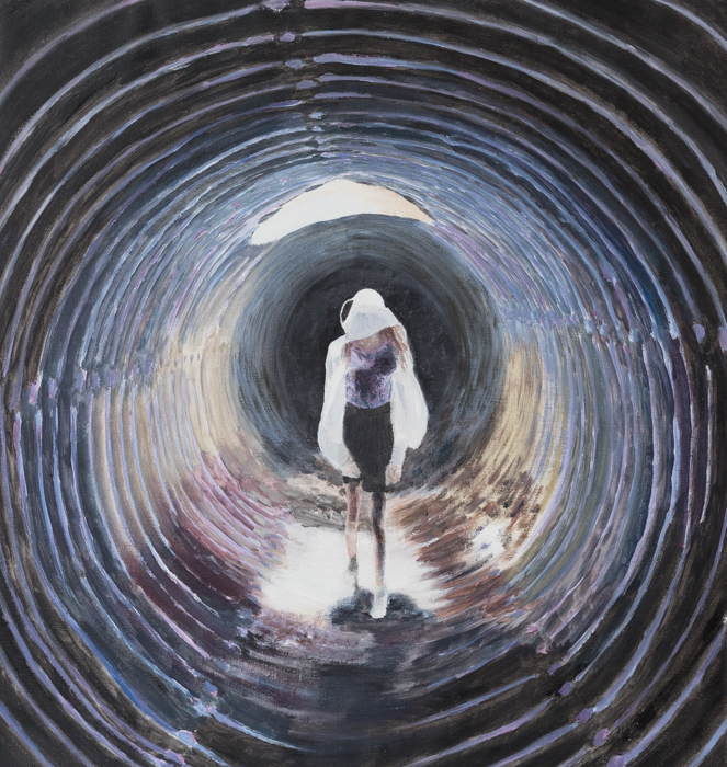 Een gedaante loopt in een grote rioolbuis en komt ongewild in the spotlight te staan door het invallend zonlicht.